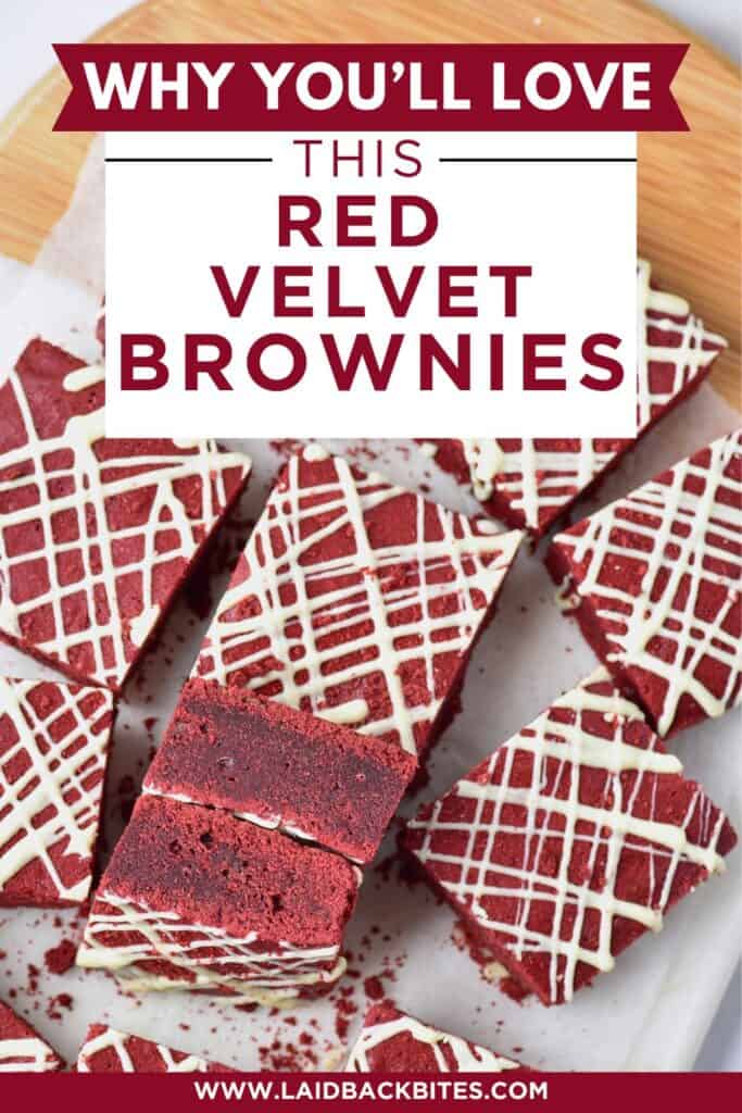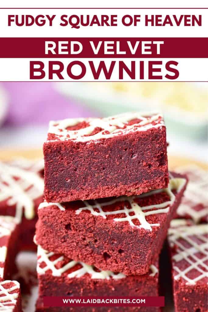 Soft red velvet brownies cut into squares and drizzled with white chocolate.