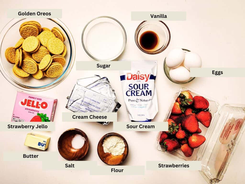 - For the Topping: Crushed golden Oreos, strawberry jello mix, and a little melted butter combine for that crunchy strawberry topping we all love.